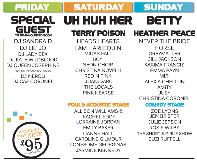 GOGO Festival is all about getting what you want. Hot women. Top tunes. Great DJs and Amazing Live performances. All wrapped up in one mammoth weekend. And that’s not all. Take a sky high thrill ride from 12,000 feet up on one of the adrenaline inducing flights of fancy, or chill on terra firma to some of the top international female performers including Uh Huh Her and BETTY with an L Word twist. Exercise your tongue with a twist of taste explosions from across the globe and shop around for gorgeous gifts in the market zone. Finish each night with a dirty disco and what have you got? A cocktail of mischief, mayhem and fabulousness, for women to enjoy, mix, mingle and have fun.