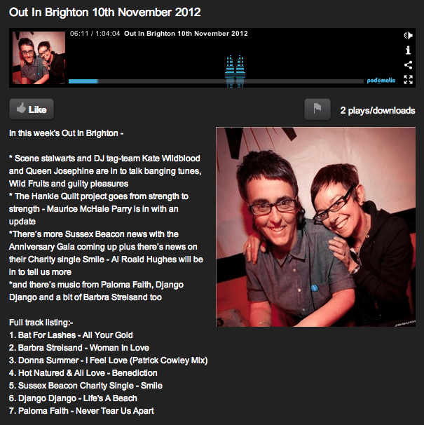 Here it is – listening for your pleasure. Well hopefully as me and the missus waffle on in a camp manner for far too long about tunes, female DJs, house, disco, The Wild Fruit Red Party, DSD, Brighton Pride, the Wild Fruit tent, Mr Duffie, Sunday Sundae, Audio and the tunes we can’t be without. That’ll be Babs, Donna and Hot Natured & Ali Love then. Enjoy. And stay tuned in the future for more as Queenie and I attempt to fill Out In Brighton’s guest slot on a regular basis. Oh er. x