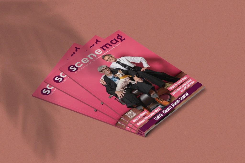 So this is a first – us and our Arnie as cover stars. Yes, for some reason, our mugs have been deemed suitable enough to help launch the return of the all-new print edition of Scene Magazine here in Brighton and Hove. A LGBTQ+ History Month special that centres on the politics of memory — who is written into history, who is erased, and why those questions feel increasingly urgent. Just what we need as the threat to our present remains an ever-increasing danger. Time to take stock, learn lessons of the past and focus on the power we have as a community to make lasting future change. That and admire the Chris Jepson’s Uncut Proud Joy captured grin on a certain Portuguese Alopeca tail-less rescue dog who landed in a certain pair of lesbians’ laps. Arnie, the cover boy, god we’ll never going to hear the end of this!